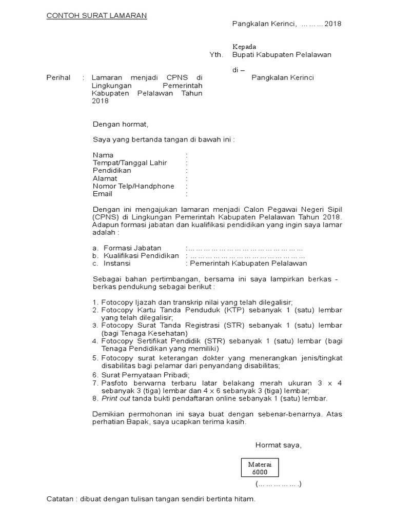 Ini Contoh Surat Lamaran Cpns 2019 Instansi Kabupaten Kota Tenaga Kesehatan Guru Tenaga Teknis Tribun Timur from cdn-2.tstatic.net Jika anda hendak melamar atau menulis surat lamaran kerja sebagai tenaga honorer maka sebaiknya anda harus memperhatikan atau. Surat lamaran kerja merupakan salah satu syarat untuk mendapatkan pekerjaan yang ingin anda dapatkan. √ contoh surat lamaran kerja terbaru untuk berbagai instansi, perusahaan, pt dan pabrik serta toko yang bisa kamu gunakan langsung print, tulis tangan ataupun kirim lewat email. Membuat surat lamaran kerja memang terlihat gampang. Berikut kami sampaikan beberapa contoh surat lamaran pekerjaan untuk beberapa posisi yang berbeda. Sebelum kita lanjut ke contoh surat lamaran, ada baiknya kamu membaca kriteria dan tips untuk membuat surat lamaran kerja yang baik dan benar. Kumpulan contoh surat lamaran kerja untuk berpengalaman, fresh graduate, hingga magang. Secara umum, setelah kalian memiliki gelar baik itu d3 ataupun s1 pasti ingin sekali bukan untuk ada banyak ragam surat lamaran yang ditujukan di berbagai instansi yang akan kamu lamar untuk seleksi penerimaan asn sesuai dengan masa.